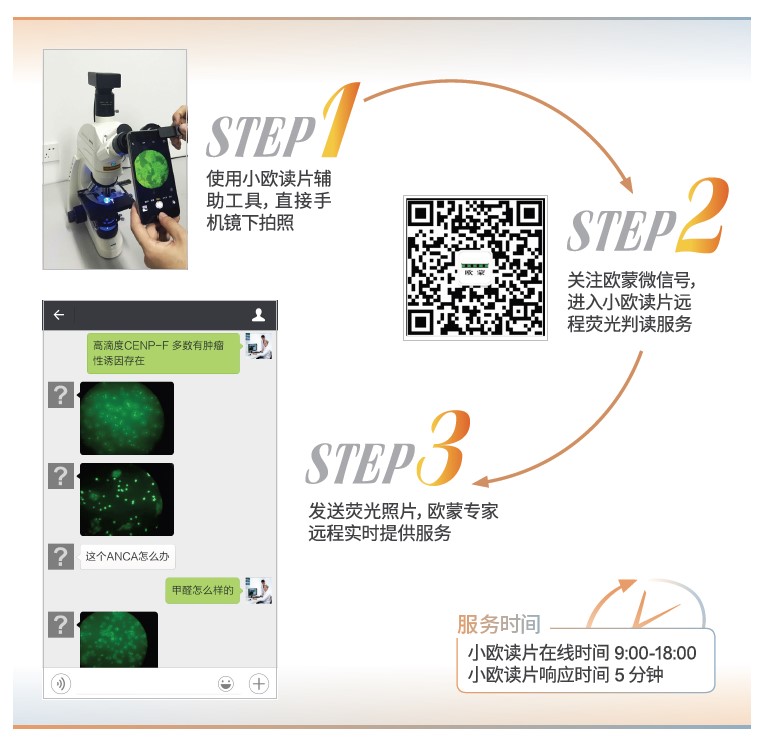 小歐讀片*:歐蒙技術團隊傾情打造云服務端小歐讀片,用戶只需通過手機拍照的形式向平臺發送圖片,即可獲得歐蒙專家團隊的及時服務,該平臺提供專業化、標準化的熒光核型疑難片遠程判讀服務,隨時隨地解決客戶難題。