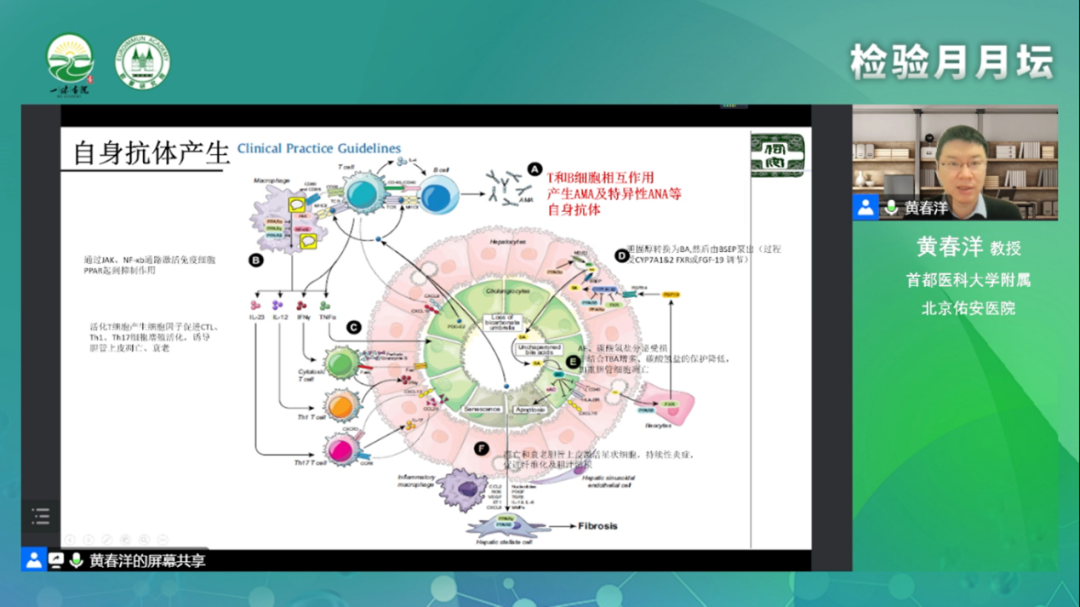 學(xué)術(shù)分享環(huán)節(jié)的最后,黃春洋教授指出自身抗體在自身免疫性肝病的診斷及預(yù)后判斷的作用。本次會(huì)議的講題就是從自身抗體的角度來(lái)看一下PBC有哪些疾病特點(diǎn)。主要分享從PBC自身抗體的產(chǎn)生、PBC自身抗體的分布以及不同自身抗體陽(yáng)性PBC的特點(diǎn)三大部分展開(kāi)。首先黃教授對(duì)PBC疾病的定義以及自身抗體產(chǎn)生的機(jī)制進(jìn)行了簡(jiǎn)要的介紹,他指出PBC是一種由自身免疫反應(yīng)介導(dǎo)、慢性的、進(jìn)行性膽汁淤積性肝病。PBC的臨床特點(diǎn)包括膽汁淤積、相關(guān)自身抗體陽(yáng)性及特征性的肝臟病理變化。黃教授對(duì)自身抗體做了大篇幅地講解。自身抗體的產(chǎn)生基因及環(huán)境等因素相關(guān),免疫耐受打破。隨后,黃教授又利用多篇研究數(shù)據(jù)介紹了自身抗體檢測(cè)體對(duì)PBC診斷及病情預(yù)后判斷的作用。他強(qiáng)調(diào),抗線粒體抗體(AMA),它是PBC的血清學(xué)診斷標(biāo)志,其M2亞型診斷PBC的靈敏度和特異度高達(dá)95%以上,但也可以出現(xiàn)在其他肝病患者,多表現(xiàn)為低滴度自身抗體。除此之外,黃教授又結(jié)合自身多年的臨床實(shí)踐經(jīng)驗(yàn),對(duì)抗著絲點(diǎn)抗體(ACA)、抗210抗體等ANA特異性檢測(cè)指標(biāo)在PBC中的預(yù)后及診療價(jià)值一一進(jìn)行了詳細(xì)地介紹。最后,黃春洋教授對(duì)上述自身抗體在PBC診療過(guò)程中的作用進(jìn)行了總結(jié)。