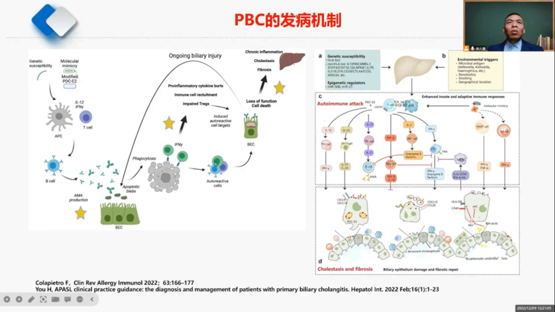仲教授接著介紹了PBC相關(guān)自身抗體,介紹了第一類(lèi)抗體如AMA和AMA M2的核型、相關(guān)抗原及對(duì)應(yīng)相關(guān)疾病。第二類(lèi)抗體如核膜型的抗gp210抗體、核點(diǎn)型的抗sp100抗體、著絲點(diǎn)型的抗CENP抗體都與PBC相關(guān)。通過(guò)蛋白組分的技術(shù)檢測(cè)到抗KLHL12和HK1抗體在AMA陰性的患者中檢測(cè)率高達(dá)50%。仲教授還介紹PBC病因?qū)W主要有基因組學(xué)、表觀遺傳、環(huán)境因素等相關(guān)內(nèi)容。最后分享了3例PBC病例報(bào)道,包括PBC診斷不及時(shí)的老人、罕見(jiàn)兒童PBC、新冠mRNA疫苗誘發(fā)急性自身免疫樣肝炎伴非典型AMA和ANA。