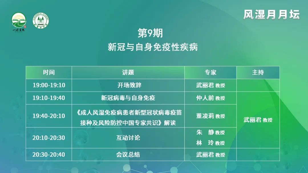 2023年4月17日(周一),由一味書院主辦的《風濕月月壇(第9期)—新冠與自身免疫性疾病》于線上成功舉行。本次論壇由新疆維吾爾自治區人民醫院武麗君教授擔任大會主席,原上海長征醫院仲人前教授、華中科技大學同濟醫學院附屬同濟醫院董凌莉教授作為講課嘉賓,四川省人民醫院朱靜教授、汕頭大學醫學院第一附屬醫院林玲教授作為本次大會的討論嘉賓。