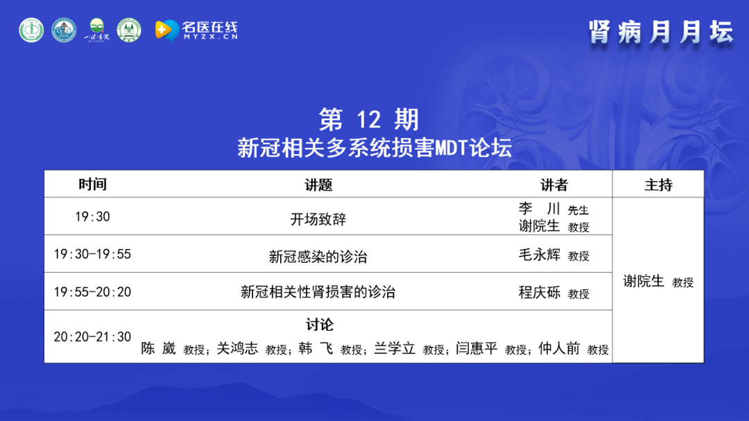 2023年4月11日,由北京中西醫(yī)結(jié)合學(xué)會腎臟病專業(yè)委員會舉辦的《腎病月月壇(第12期)——新冠相關(guān)多系統(tǒng)損害MDT論壇》于線上成功舉辦。本次論壇由北京中西醫(yī)結(jié)合學(xué)會腎臟病專業(yè)委員會主任委員、解放軍總醫(yī)院第一醫(yī)學(xué)中心謝院生教授擔任大會主席,歐蒙醫(yī)學(xué)診斷CEO,一味書院執(zhí)行院長、發(fā)起人李川先生作為致辭嘉賓,北京醫(yī)院毛永輝教授、解放軍總醫(yī)院第二醫(yī)學(xué)中心程慶礫教授作為講課嘉賓,中山大學(xué)附屬第一醫(yī)院陳崴教授、北京協(xié)和醫(yī)院關(guān)鴻志教授、浙江大學(xué)醫(yī)學(xué)院第一附屬醫(yī)院韓飛教授、北京大學(xué)航天臨床醫(yī)學(xué)院蘭學(xué)立教授、首都醫(yī)科大學(xué)附屬北京佑安醫(yī)院閆惠平教授以及上海長征醫(yī)院仲人前教授作為本次大會的討論嘉賓。