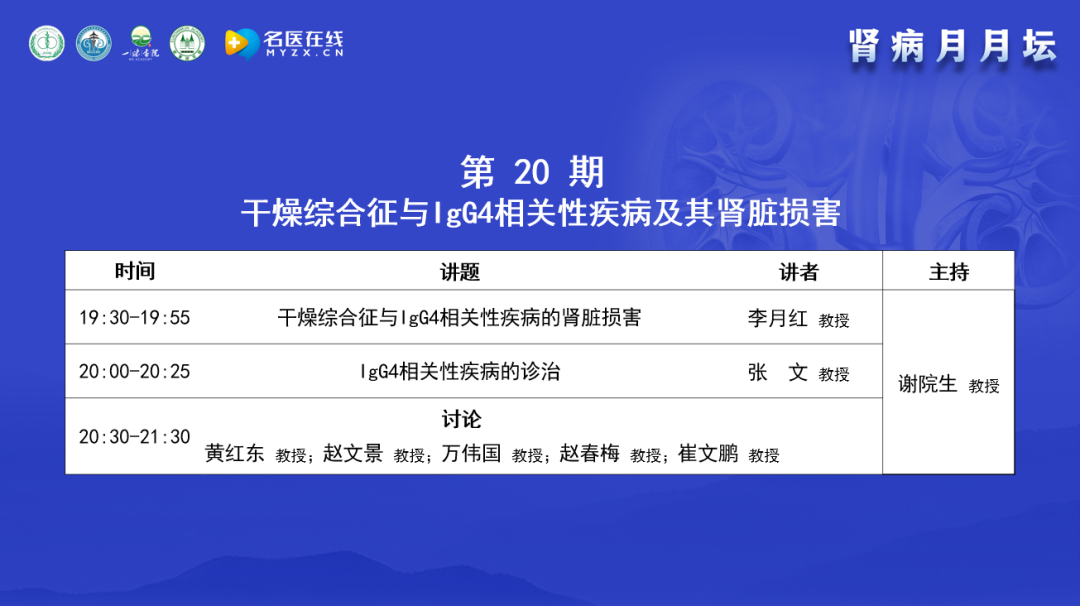 謝教授介紹了“腎病月月壇”的歷史,“腎病月月壇“是在2022年5月疫情防控期間開始的線上交流活動。其形式是講座與病例討論相結(jié)合;論壇內(nèi)容以臨床問題和臨床需求為導向,通過中醫(yī)和西醫(yī)的結(jié)合、腎科和其他學科的結(jié)合,以期提升腎臟病相關(guān)領(lǐng)域的診療水平。本期討論和交流的主要內(nèi)容是干燥綜合征與IgG4相關(guān)性疾病及其腎臟損害,邀請的講者和討論嘉賓都是在該領(lǐng)域有很深造詣的專家,相信能為大家?guī)碛袃r值的內(nèi)容。
