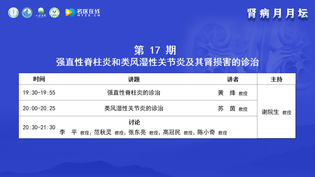 2023年9月12日,由北京中西醫(yī)結(jié)合學(xué)會(huì)腎臟病專業(yè)委員會(huì)舉辦的《腎病月月壇(第17期)——強(qiáng)直性脊柱炎和類風(fēng)濕性關(guān)節(jié)炎及其腎損害的診治》于線上成功舉行。本次論壇由北京中西醫(yī)結(jié)合學(xué)會(huì)腎臟病專業(yè)委員會(huì)主任委員、解放軍總醫(yī)院謝院生教授擔(dān)任大會(huì)主席,解放軍總醫(yī)院第一醫(yī)學(xué)中心黃烽教授、北京大學(xué)人民醫(yī)院蘇茵教授作為講課嘉賓,中日友好醫(yī)院李平教授、上海交通大學(xué)醫(yī)學(xué)院附屬第一人民醫(yī)院范秋靈教授、首都醫(yī)科大學(xué)附屬北京積水潭醫(yī)院張東亮教授、鄭州大學(xué)第一附屬醫(yī)院高冠民教授以及武漢大學(xué)中南醫(yī)院陳小奇教授作為本次大會(huì)的討論嘉賓。