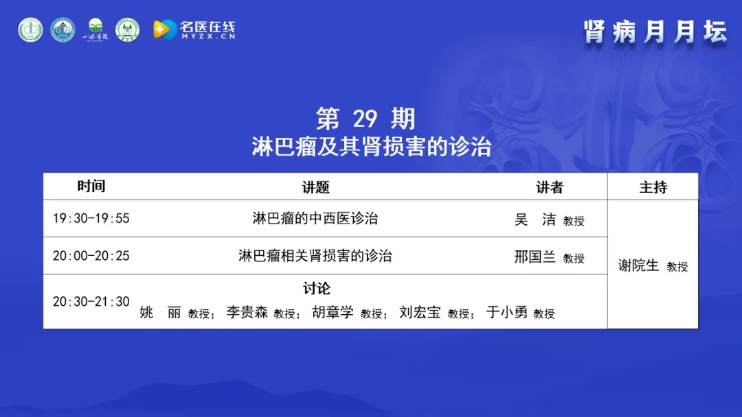 今天的主題是淋巴瘤及其腎損害的診治,很榮幸邀請到了在該領域有很深造詣的專家,包括血液病專家、臨床腎臟病專家、腎臟病理專家、中醫(yī)和西醫(yī)專家,都是一線非常有經(jīng)驗的科主任,一起進行學術講座、點評與討論。