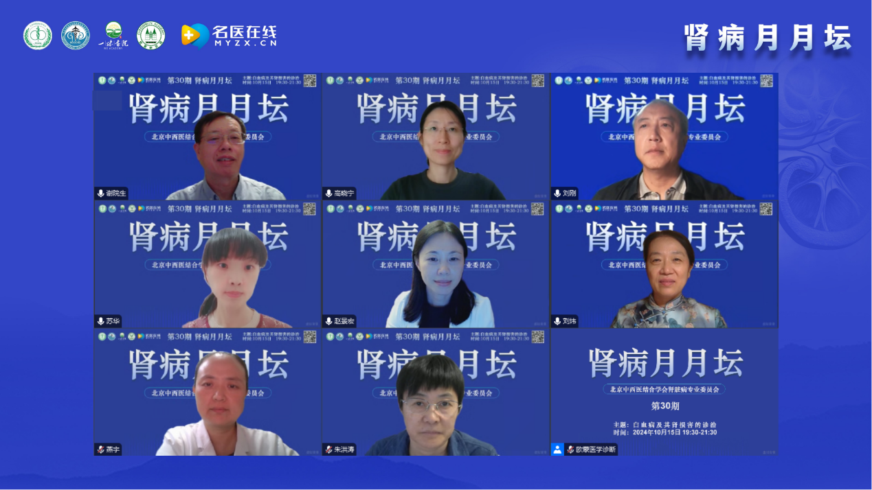 2024年10月15日,由北京中西醫(yī)結(jié)合學(xué)會(huì)腎臟病專業(yè)委員會(huì)舉辦的《腎病月月壇(第30期)——白血病及其腎損害的診治》于線上成功舉行。本次論壇由北京中西醫(yī)結(jié)合學(xué)會(huì)腎臟病專業(yè)委員會(huì)主任委員、北京中西醫(yī)結(jié)合腎臟疑難病會(huì)診中心主任、北京大學(xué)航天中心醫(yī)院主任醫(yī)師特聘教授、解放軍總醫(yī)院及南開大學(xué)醫(yī)學(xué)院博士生導(dǎo)師謝院生教授擔(dān)任大會(huì)主席,解放軍總醫(yī)院高曉寧教授、北京大學(xué)第一醫(yī)院劉剛教授作為講課嘉賓,華中科技大學(xué)協(xié)和醫(yī)院蘇華教授、陸軍軍醫(yī)大學(xué)新橋醫(yī)院趙景宏教授、 河南省兒童醫(yī)院劉煒教授、北京大學(xué)人民醫(yī)院燕宇教授以及新疆醫(yī)科大學(xué)第一附屬醫(yī)院朱洪濤教授作為本次大會(huì)的討論嘉賓。